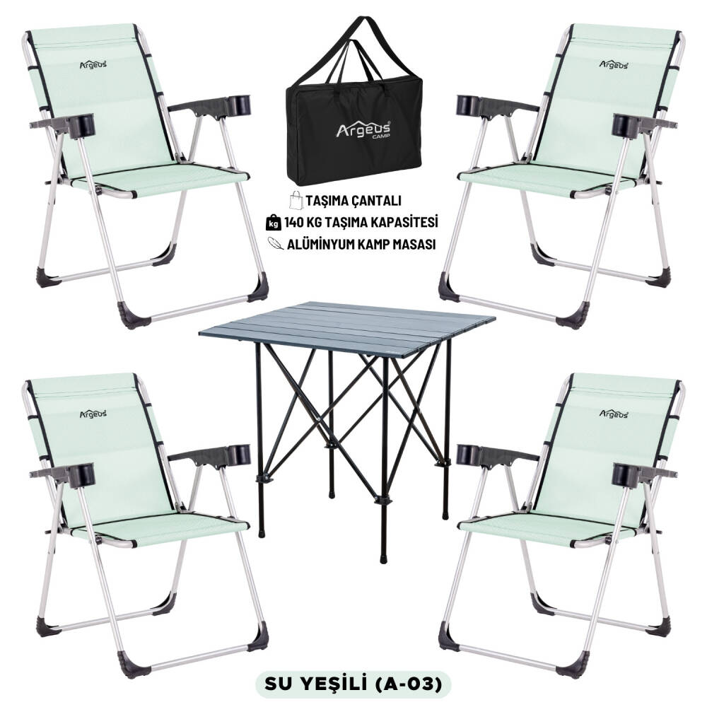 Hayalinizdeki kamp deneyimini yaşamak için ihtiyacınız olan her şey bu sette! 4 Adet Katlanır Kamp Sandalyesi ve Alüminyum Masa Seti - Rock Su Yeşili ile doğanın kalbinde konforlu ve keyifli anlar biriktirin. İster ailenizle piknik yapın, ister arkadaşlarınızla kamp kurun, bu set size eşlik edecek en iyi yol arkadaşı olacak.