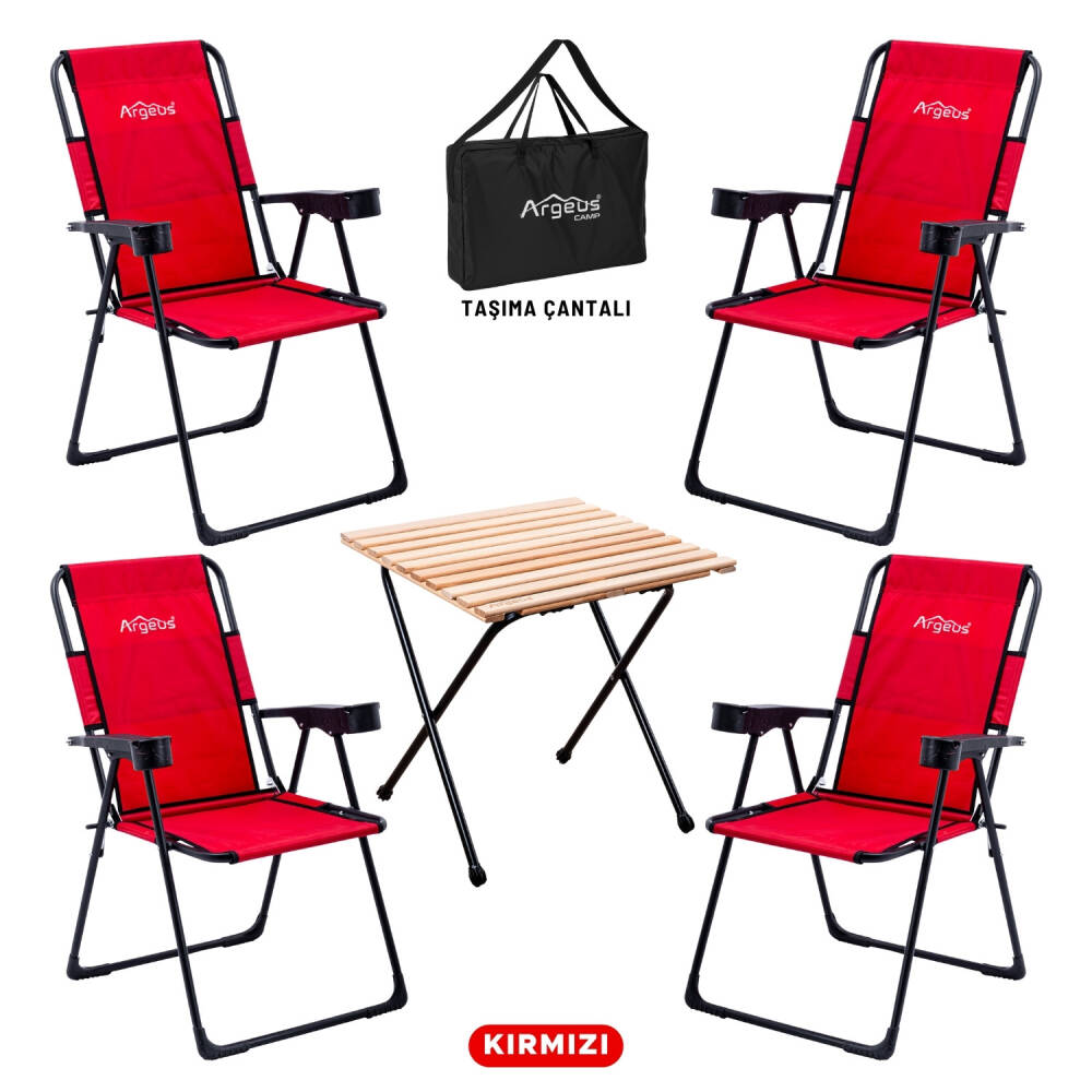 Argeus Rest 4'lü katlanır kamp sandalyesi ve masa seti ile doğanın tadını çıkarın! Taşıma çantalı, kırmızı renkli bu set, 130 kg taşıma kapasitesiyle konfor ve pratikliği bir araya getiriyor.