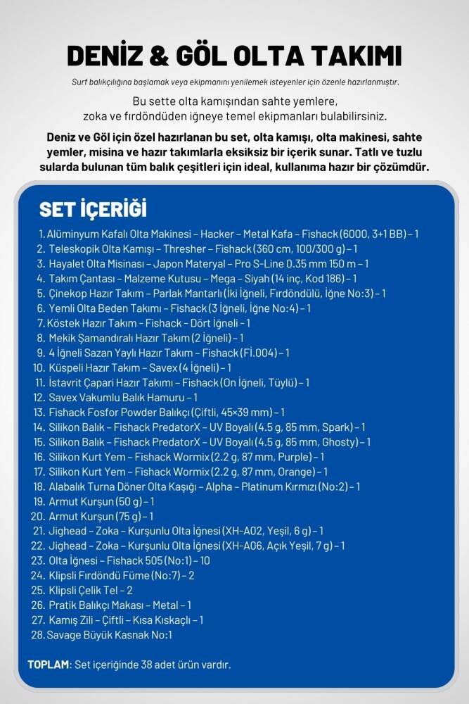 Tutkulu balıkçılar ve doğa severler! Hayallerinizdeki avı yakalamak için ihtiyacınız olan her şey bu sette! 'Deniz ve Göl Profesyonel Olta Takımı Seti 1', size unutulmaz bir balıkçılık deneyimi sunmak için tasarlandı. İster deneyimli bir profesyonel olun, ister balıkçılığa yeni başlıyor olun, bu set ile kıyıdan, gölden veya tekneden eşsiz avlar yapabilirsiniz. Hazırlanın, çünkü bu set sadece bir olta takımı değil, aynı zamanda doğayla iç içe keyifli anılar biriktirmenin de anahtarı!
