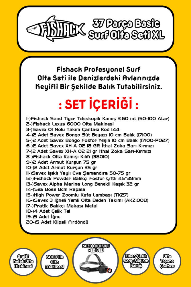 Güçlü ve dayanıklı Fishack Sand Tiger kamışı ve yüksek kapasiteli Fishack Lexus 6000 olta makinesi ile her türlü deniz koşulunda başarılı avlar yapmanızı sağlar.
