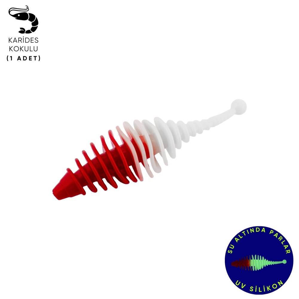Balık avında üstün performans için Fishack Wormix silikon kurt yem. 3g ağırlık, 65mm uzunluk, kırmızı/beyaz renk, karides kokusu ve UV silikon teknolojisi ile avcı balıkların dikkatini çekin.