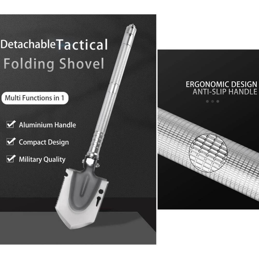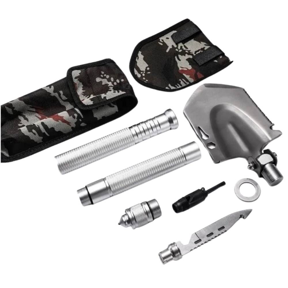 Katlanabilir yapısı sayesinde kolayca taşınabilen bu çok amaçlı kürek; testere, bıçak, tel kesici, cam kırıcı, düdük ve şişe açacağı gibi toplam 12 farklı işlevi bir araya getirir.
