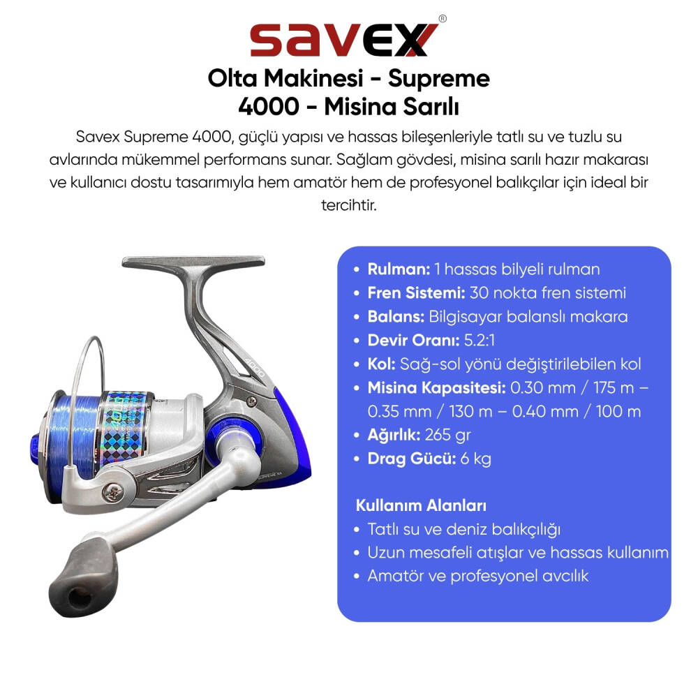 • Hazır Kullanım: Misina sarılı Savex Supreme 4000 olta makinesiyle anında avlanmaya başlayın.
