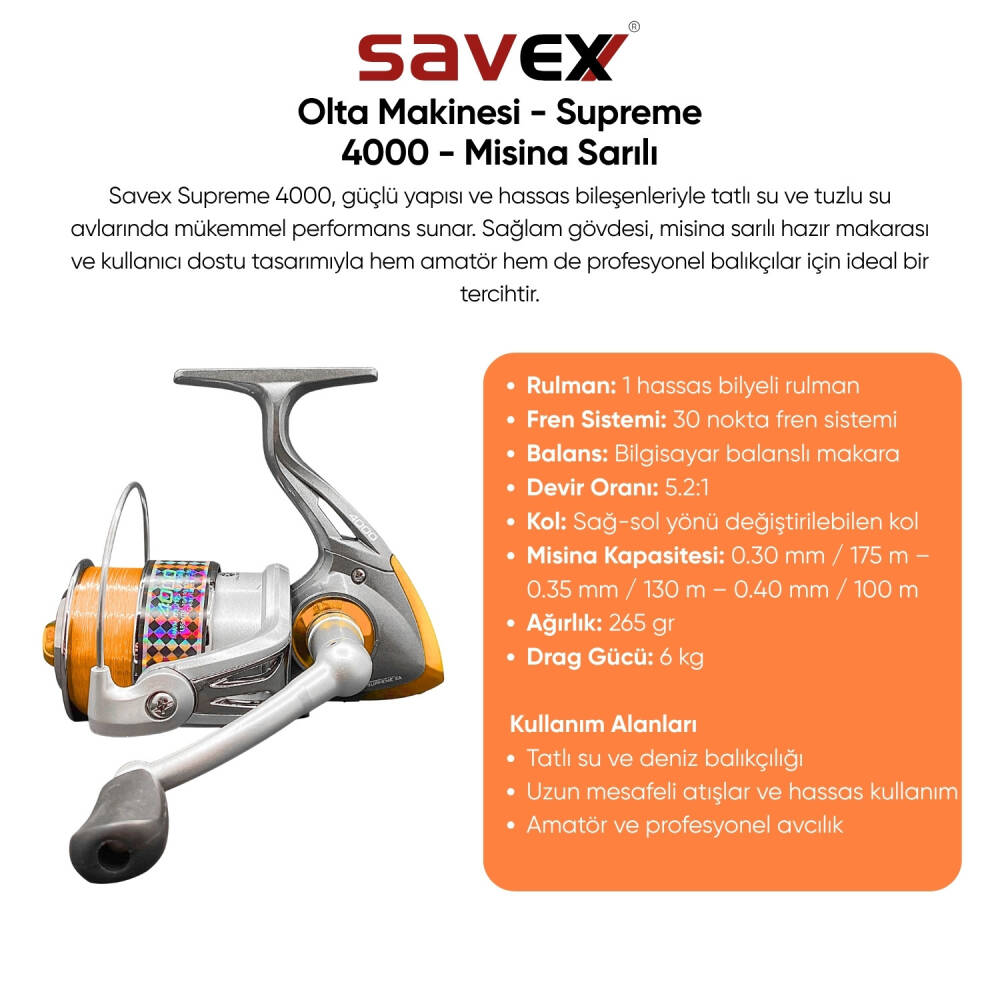 • Hazır Kullanım: Misina sarılı Savex Supreme 4000 olta makinesiyle anında avlanmaya başlayın.