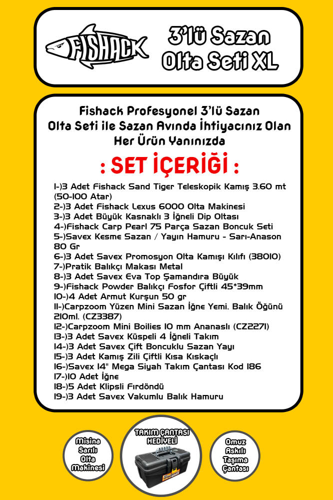 Fishack 3'lü Sazan Olta Seti XL ile sazan avında ihtiyacınız olan her şey bir arada! 52 parça ürünle eksiksiz bir deneyim.